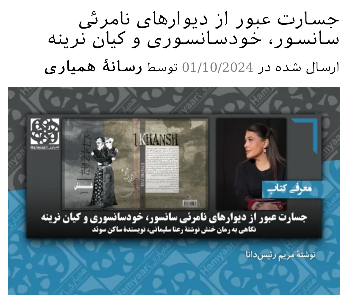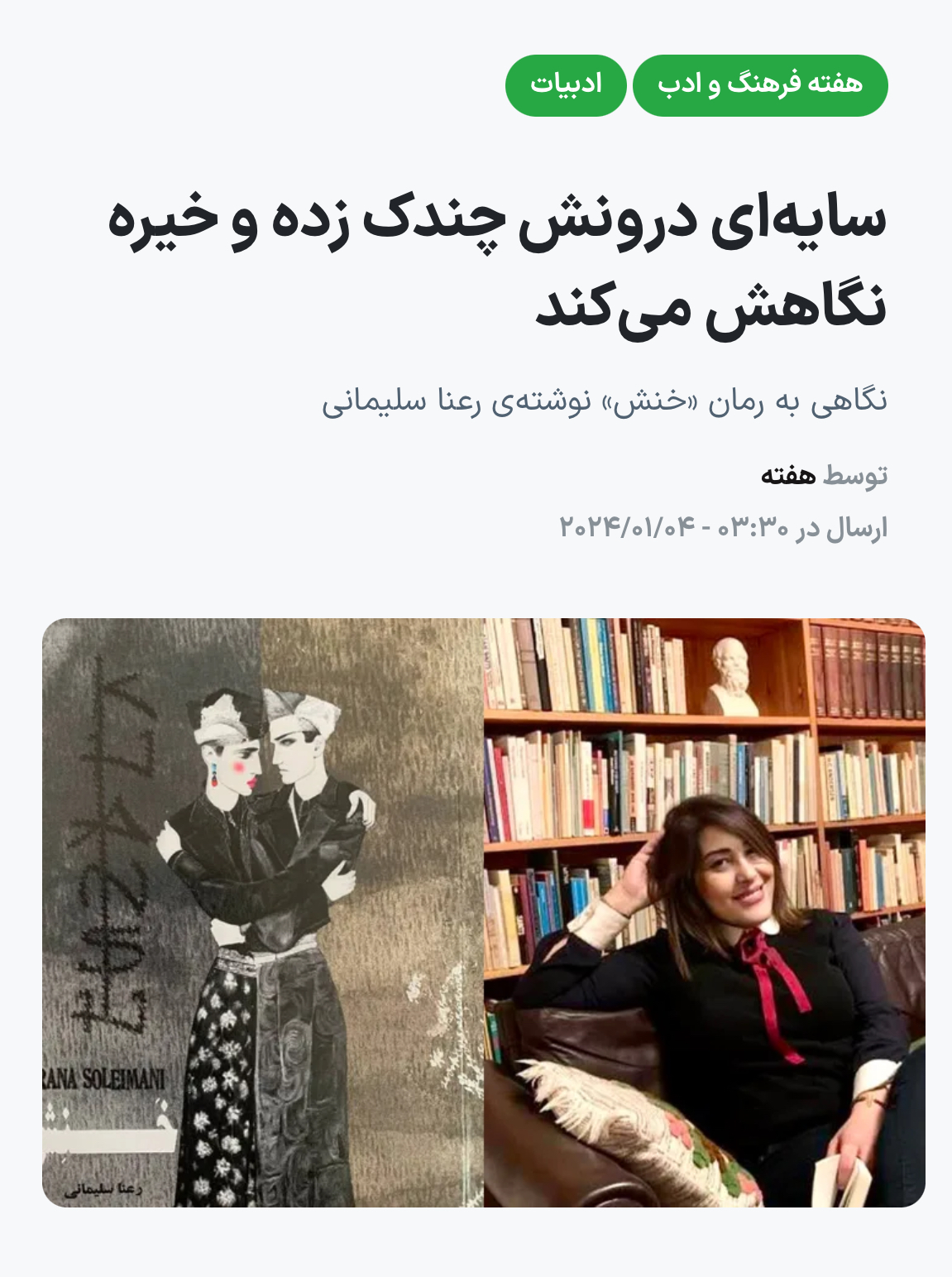 .Rana Soleimanis författarskap visar prov på mod genom hennes val av helt olika teman i sina romaner, med en mångfald av ämnen. Den realistiska romanen "Khansh", som ibland antar surrealiska former, berättar om generations- och kulturskillnader som leder till fördomar i samhället, särskilt de traditionstunga.