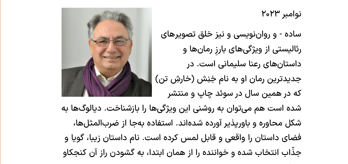 ”رعنا سلیمانی داستاننویس ایرانی ساکن سوئد در روزهای گذشته جایزه بزرگ فرهنگی شهرداری منطقه سولنتونا در استکهلم را به خاطر فعالیتهای ادبیاش در زمینه مسائل اجتماعی و به ویژه آگاهی رساندن در رابطه با تبعیض نژادی و جنسیتی را دریافت کرد. در مارس ۲۰۲۲ از همین نویسنده در بلژیک به عنوان یکی از زنان تاثیرگذار تقدیر شده بود. رعنا سلیمانی این جایزه را به کلیه زنانی «که در سراسر جهان در مقابل نابرابری و ستم ایستادهاند» تقدیم کرد.